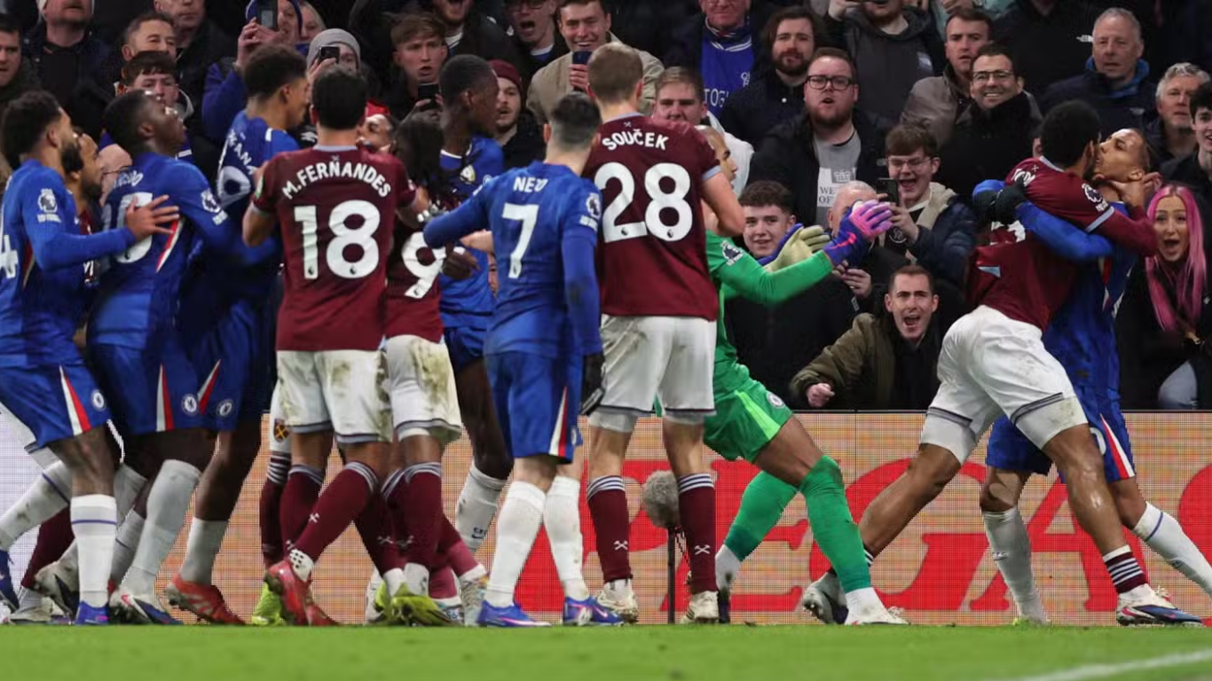 A London derby at Chelsea’s Stamford Bridge on Saturday ended in chaos after a dramatic stoppage-time winner sparked a series of scuffles that saw West Ham reduced to 10 men. Chelsea completed a stunning fightback from 2-0 down to win 3-2, but the late scenes, including a straight red card for Jean-Clair Todibo, threatened to overshadow the result.
